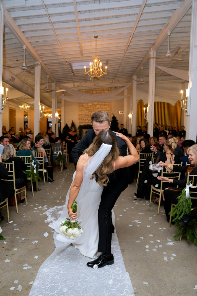 The ceremony took place in the East Wing. A dreamy all-white space with wood beams, creamy brick walls, and so much natural light. It’s a blank canvas that doesn’t feel too blank. Like it already has soul but lets you put your full personality into it. For this wedding, the couple added soft winter greenery to the chairs and staircase, pops of pinecones, and tall candlelit centerpieces that gave the whole space a romantic glow. And can we talk about that big Christmas tree at the altar? It was the perfect festive touch. Everything felt warm and inviting without being over-the-top!