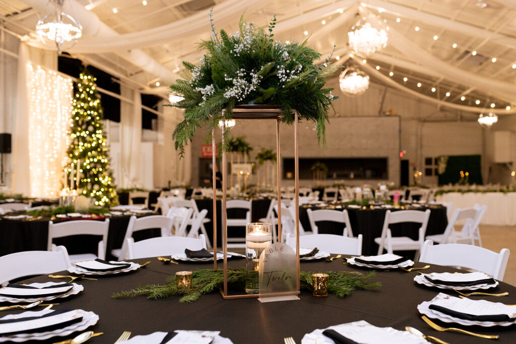 The Main Hall is where The Olde Wicks Factory really gets to show off. This space is massive, think tall ceilings draped with chiffon, glowing chandeliers, and tons of room for dancing, dining, and everything in between. The couple went all-in on the winter theme with black tablecloths, layered greenery, candles floating in glass vases, and metallic accents that sparkled under the string lights. Also worth noting? The venue is super flexible with layout options. They had a statement sweetheart table in front of a trio of Christmas trees, and guests were seated at a mix of round and banquet-style tables. There was even an ice sculpture monogram, which was the coolest surprise (literally).