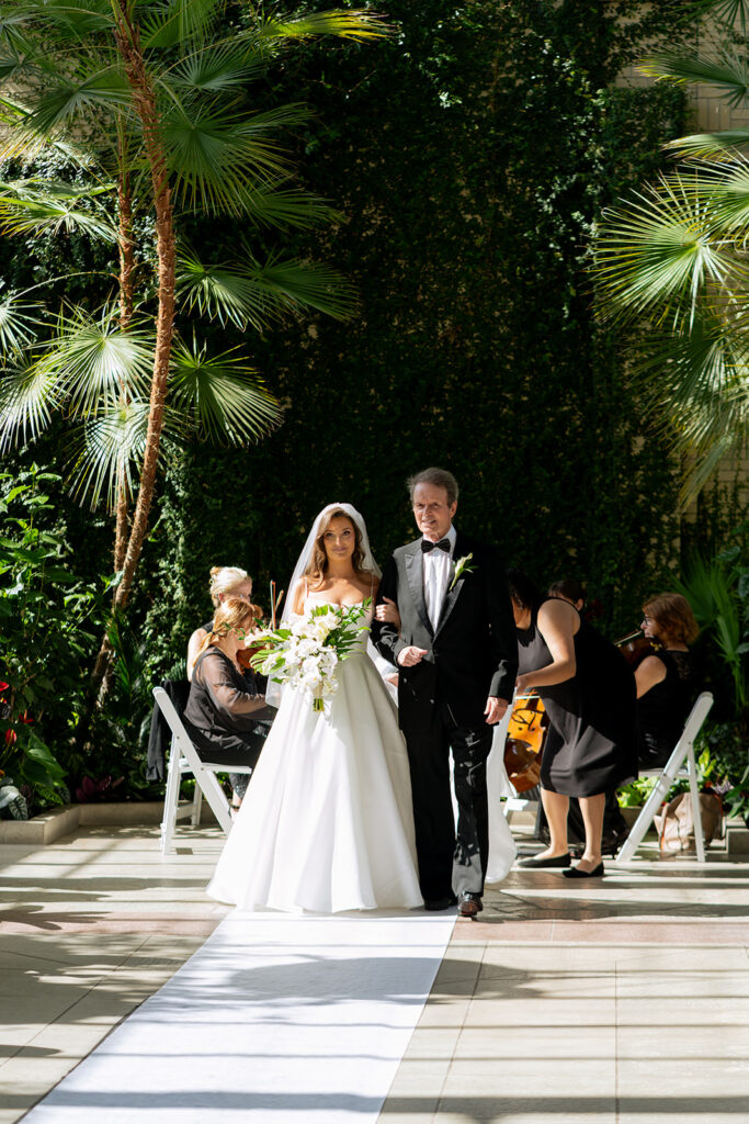 From the very beginning, every detail of this summer wedding felt intentional. Their invitation suite set the tone with clean, minimalist design paired with vintage accents, a subtle nod to the timeless aesthetic incorporated throughout the day. We styled their details with soft neutral tones, an old postcard of the city, and a chic velvet ring box that tied everything together. At The Jewel Box, the ceremony setup had modern white pedestals overflowing with soft white flowers and tropical greenery, the perfect complement to the lush glass greenhouse. Later at The Coronado, that aesthetic shifted to moody romance with gold-rimmed frames, black linens, floating candles, and twinkle-lit baby’s breath. Classic, luxe, and effortlessly cool!