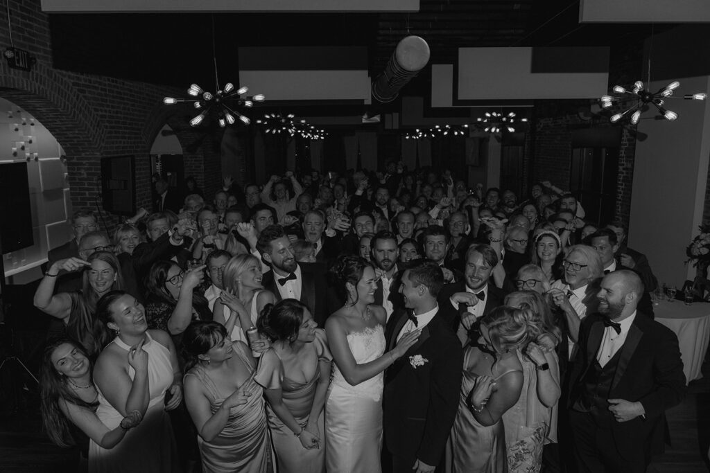 You don’t need to over-style this venue. The architecture does the work for you. Whether you lean minimal and modern or romantic and floral-heavy. 612North’s clean lines and warm textures make it easy to bring your vision to life. In this real wedding, the couple opted for a soft palette of ivory and greenery. The tables were kept simple with neutral linens, floating candles, and white blooms, letting the exposed brick walls and tall windows shine in every photo. Their cake? Retro and playful with just the right touch of personality.